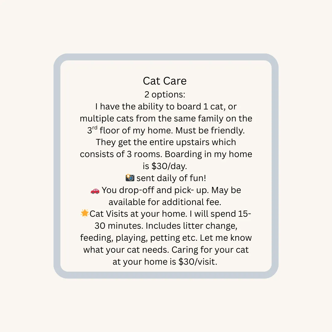 If you give 48 hours notice, I will move your scheduled day to another day if possible. Boarding must be cancelled with 3 days to avoid a cancellation charge.