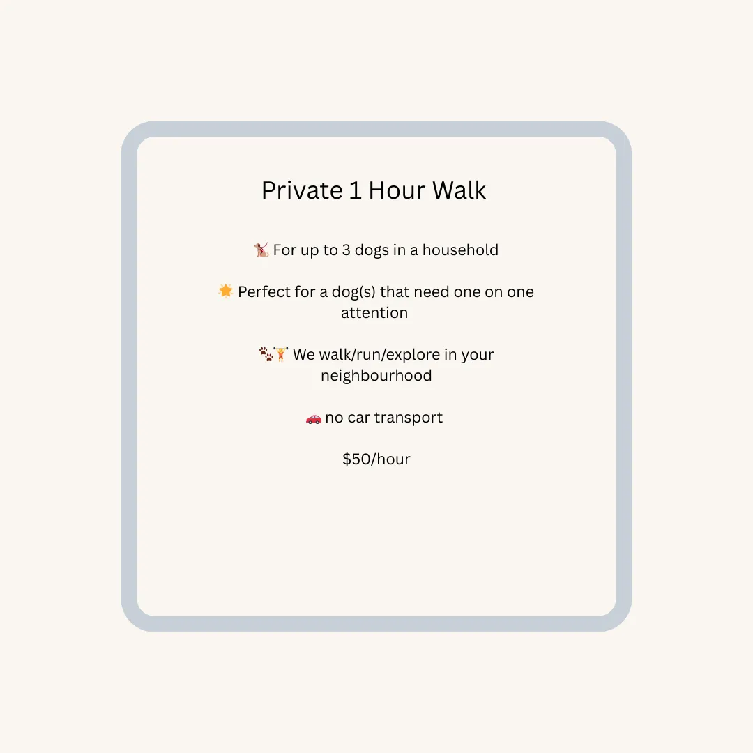 Doggy Daycare is fun! Your dog joins the outings and does a walk/hike/play. You'll get updates and pictures of our fun. They come home tired!